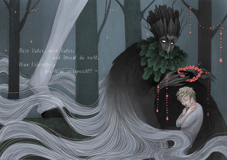 Ausgesprochen gekonnt ist auch gezeichnet in mehreren Etappen, wie der Junge langsam dem Tod anheimfällt, wie der Erlkönig mit einem Kragen aus Blättern ihm eine Art Totenkranz über den Kopf hält. Blutig rosa gefärbt, rahmt er mit Bluts-Tropfen das Kind ein. Mit geschlossenen Augen hockt der Knabe da, ganz seinem Schicksal ergeben.