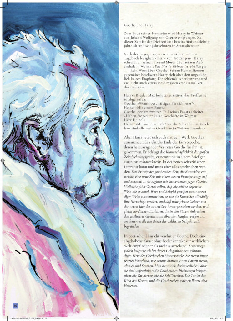 Der kurzen und einzigen Begegnung mit Goethe widmen sie eine ausführliche Darstellung, schildern das Treffen aus der Sicht der Beteiligten und des Bruders von Heine. Wichtiger ist ihnen vor allem Heines Urteil. Der habe Goethe verehrt, aber dessen „Meisterwerke“ auch kritisch gesehen: „Sie zieren unser teueres Vaterland, wie schöne Statuen einen Garten zieren, aber es sind Statuen. Man kann sich darin verlieben, aber sie sind unfruchtbar: Die Goetheschen Dichtungen bringen nicht die Tat hervor wie die Schillerschen. Die Tat ist das Kind des Wortes, und die Goetheschen schönen Worte sind kinderlos.“ (S. 20)