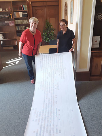 Genealogische Forschungen zur Familie Göthe in Nordthüringen haben jetzt Dr. Barbara Heuchel, Vorsitzende der Goethe-Gesellschaft Sondershausen (im Foto links), und Edith Baars (im Foto rechts) vorgelegt: „Die unbekannten Verwandten. Was Kirchenbücher verraten“. In ihrer mehrmonatigen Forschungsarbeit haben sie 1600 Personen aufgespürt. Ausgedruckt auf einer Rolle, misst das ca. 8 Meter (siehe Foto). Ein Großteil der Vorfahren „Göthe“ stammt aus dem kleinen Dorf Berka bei Sondershausen, beginnend beim Urururgroßvater Hans d. J. (geb. 1603 in Berka, gest. 1686 in Artern).