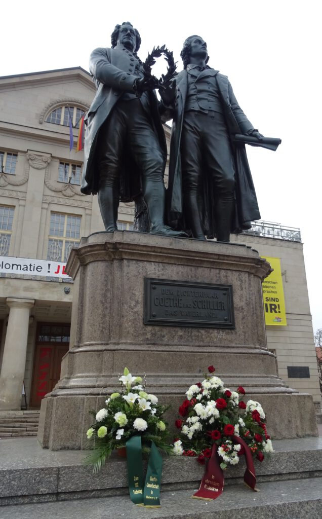 Heute vor 192. Jahren starb Johann Wolfgang Goethe in Weimar. Die Goethe-Gesellschaft gedenkt diesem Tag, wie auch die Stadt Weimar, mit einem Blumen-Gesteck vor dem Goethe-Schiller-Denkmal auf dem Theaterplatz. Wir danken dem Blumenhaus Welzel für das gewohnt gelungene und passende Blumen-Arrangement.