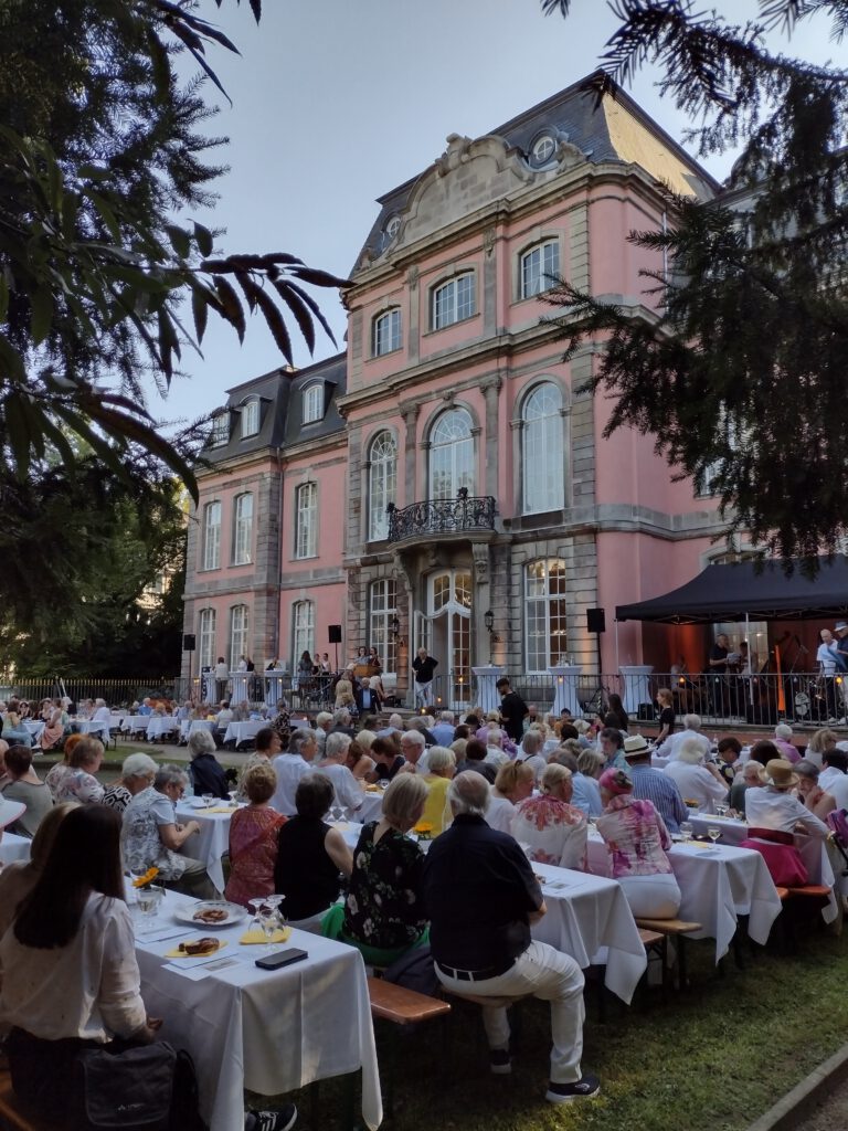 Rechtzeitig zum runden Geburtstag war die Fassade saniert, konnte man die Gerüste entfernen – mehr als nur eine nette Geste des Danks war es, auch die beteiligten Handwerker zum Festprogramm einzuladen. Freundlich gaben sie Auskunft über diffizile Fragen ihrer Arbeit. Die Feier erwies sich als Folge von Leckerbissen verschiedener Art. Zum Auftakt (und gegen Ende wieder) sorgten Wolf Doldinger & Best Friends für gediegene Musik. Robert Haas-Zens erläuterte als Fachplaner der Denkmalpflege, vor welche Hürden sich Konservatoren gestellt sehen angesichts der Aufgabe, ein Schloss zu sanieren, das bereits zu Zeiten von Goethes Besuchen nebenan bei Familie Jacobi ein paar Jahre erlebt hatte.