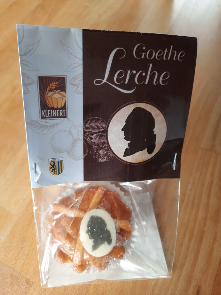 Auf Anregung des Vorstands der Leipziger Goethe-Gesellschaft hat der Bäcker- und Konditormeister Jürgen Kleinert eine „Goethe-Lerche“ kreiert. Sie erweitert seine Palette des gefüllten Mürbteiggebäcks, das von Leipziger Konditoren seit Ende des 19. Jahrhunderts gebacken wird, um der damaligen Überjagung der Singvögel Einhalt zu gebieten. Denn seit dem 18. Jahrhundert galten die zu einer Pastete verarbeiteten Vögel als eine Delikatesse. Auch in Goethes Küche wurden sie zubereitet. Auf einem von seiner Hand geschriebenen Bestellzettel an den Pächter seines Oberroßlaer Gutes für die im Jahr 1800 zu liefernden Naturalien waren 4 Schock Lerchen aufgeführt.