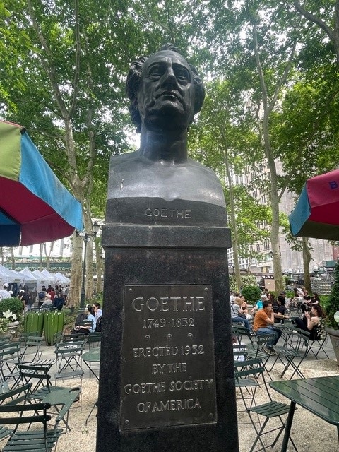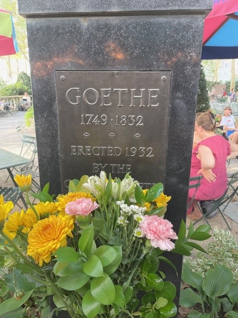 Auch wenn es in New York keine Goethe Gesellschaft gibt, kam anlässlich seines Geburtstags ein kleiner Kreis von Goethe-Verehrern zusammen, um seiner zu gedenken. Schauplatz war die 1932 von der Goethe Society of America aufgestellte Goethe-Büste, die sich im Schatten der New York Public Library im Bryant Park in Manhattan befindet. Mit einigen Blumen und Gedichten erneuerte man bei 35 Grad Celsius das Gedenken an diesen deutschen Dichter. (Text und Fotos: Dennis Schäfer)