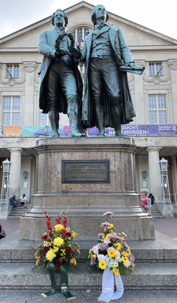 Am vergangenen Sonntag, dem 28. August, konnten wir den 273. Geburtstag von Johann Wolfgang von Goethe feiern. Aus diesem Anlass hat die Goethe-Gesellschaft einen kleinen Blumengruß am Goethe-Schiller-Denkmal in Weimar hinterlassen. Er strahlt mit dem schönen Spätsommertag prachtvoll um die Wette. Wir danken dem Blumenhaus Welzel für die immer wieder tolle Arbeit.