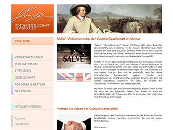 Die Ideengeberin dieses Vorhabens war seinerzeit die Leiterin der Geschäftsstelle in Weimar, Dr. Petra Oberhauser, welche, auch gegen einige Bedenken innerhalb des Vorstands, die Umsetzung zügig vorantrieb. Gerade um die Bekanntheit der Gesellschaft zu vergrößern, über ihre Tätigkeit zu informieren, und vor allem um neue Mitglieder zu gewinnen, erschien eine eigene Internetseite das ideale Mittel zu sein. Indes mangelte es an einschlägigen Vorbildern, die Orientierung hätten bieten können: Kaum eine der großen literarischen Gesellschaften verfügte über ein entsprechendes Angebot. Daher war es auch ein Glücksfall, dass das damalige Vorstandsmitglied Dr. Wolfgang Müller den Kontakt zur Technischen Universität Ilmenau herstellen konnte, welche zu dieser Zeit zahlreiche Kompetenzen im Bereich der digitalen Medien bündelte – anders als die meisten Werbeagenturen. Die Realisierung übernahm ein Team von Mitarbeitern und Studenten des Instituts für Medien- und Kommunikationswissenschaften unter Leitung von Dr. Gabriele Schade, welchem auch ich angehörte.Innerhalb weniger Monate wurden bereits bestehende Texte und Bilder digitalisiert und bearbeitet, Layoutvorschläge abgestimmt und die zukünftige Struktur der Seiten festgelegt. Im Grunde hat sich diese ursprünglich festgelegte Ordnung über die Jahre weitestgehend erhalten: Die Rubriken Gesellschaft, Publikationen, Stipendien, Mitgliedschaft und die Übersichten zu Ortsvereinigungen und ausländischen Goethe-Gesellschaften stellen auch heute immer noch das Grundgerüst des Angebots dar. Das äußere Erscheinungsbild wurde schlicht, funktional und dem technischen Stand der Zeit entsprechend gestaltet; zentrale Elemente waren die gelbe Kopfzeile mit dem Logo der Goethe-Gesellschaft und den Rubriken sowie, farblich in blau abgesetzt, ein weiterer Bereich für die Seitennavigation; direkt daneben wurden sämtliche, zumeist rein aus Text bestehende Inhalte dargestellt. Doch die Internetseite war nicht nur ein reines Informationsangebot, sie lud bereits in der frühen Phase zur Interaktion ein: Interessenten konnten über ein Online-Formular papierlos den Antrag auf Mitgliedschaft stellen. Auch nach der Erstellung blieb das Informationsangebot immer auf dem neuesten Stand – mehrfach im Monat kamen aus der Geschäftsstelle Änderungen; meist per Brief (erst später wurde das Procedere auf die papierlose Kommunikation per E-Mail umgestellt). Wenige Jahre später wurden auch die ersten ‚kosmetischen‘ Änderungen am Design und an der Gewichtung der einzelnen Rubriken vorgenommen; vor allem hielten aber Grafiken und Bilder vermehrt Einzug.