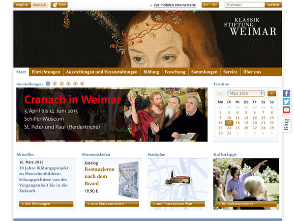 Die Klassik Stiftung Weimar zählt zu den größten und bedeutendsten Kultureinrichtungen in Deutschland. Mit ihren 25 Museen, Schlössern und historischen Häusern, darunter zahlreiche ständige Ausstellungen, mit der Herzogin Anna Amalia Bibliothek, einer Forschungsbibliothek, deren Bestand rund 1 Mio. Bände zählt, und mit dem Goethe- und Schiller-Archiv, dem ältesten deutschen Literaturarchiv, sowie mit den Parkanlagen in und um Weimar bildet die Klassik Stiftung Weimar ein wichtiges historisches, kulturelles und wissenschaftliches Zentrum Europas. Die nationale und internationale Bedeutung der Stiftung wird bekräftigt durch die Aufnahme von elf Liegenschaften des Ensembles »Klassisches Weimar« in die Liste des Weltkulturerbes der UNESCO.